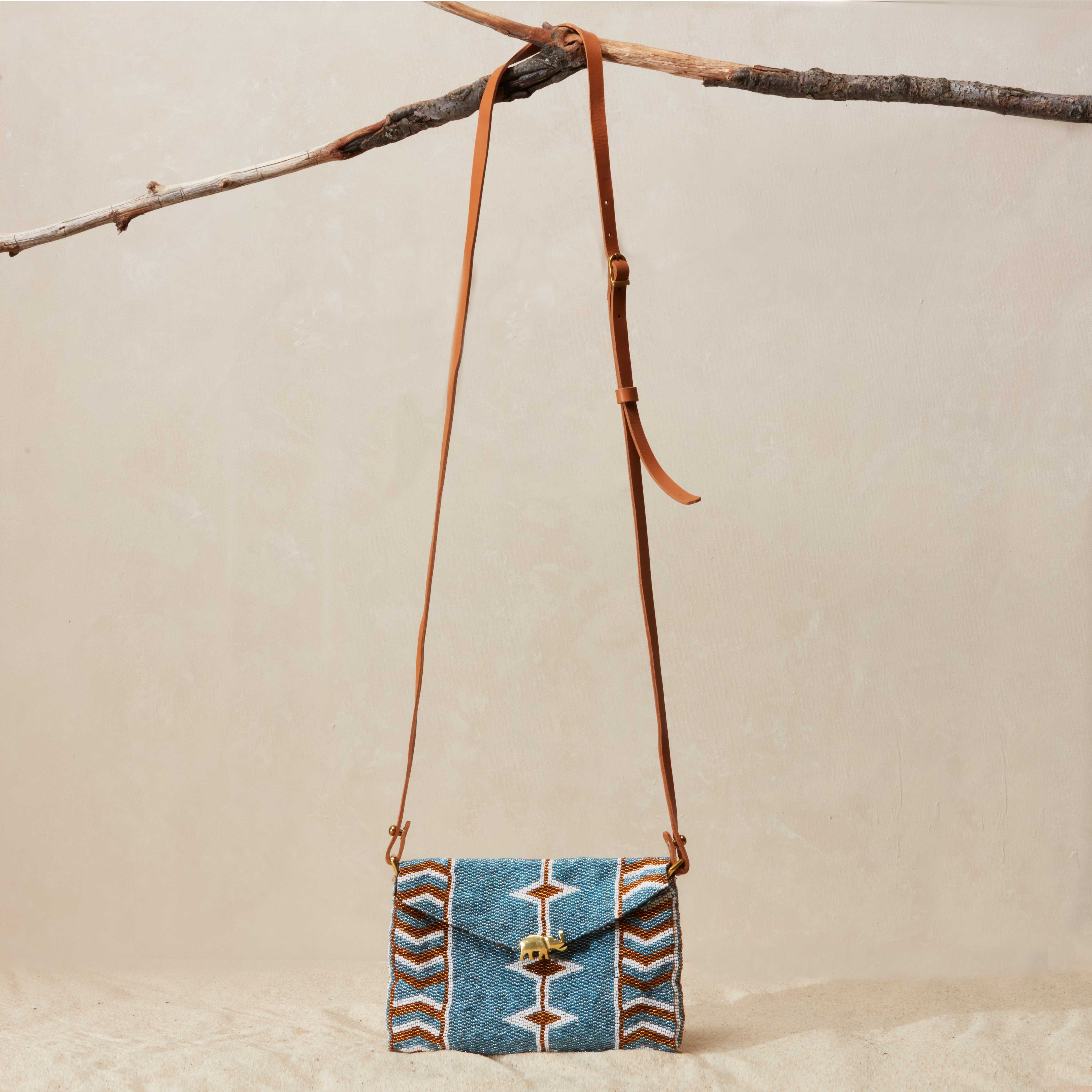 Every bag is unique: crafted by Mokogodo Maasai women from brilliant glass beads and stitched onto a traditional camel blanket for sturdiness. The finishing touches are added in Nairobi’s economically marginalized community of Kibera, where artisans craft straps from recycled Kenyan leather, line each bag with vibrant kanga cloth, and embellish it with a recycled brass elephant.